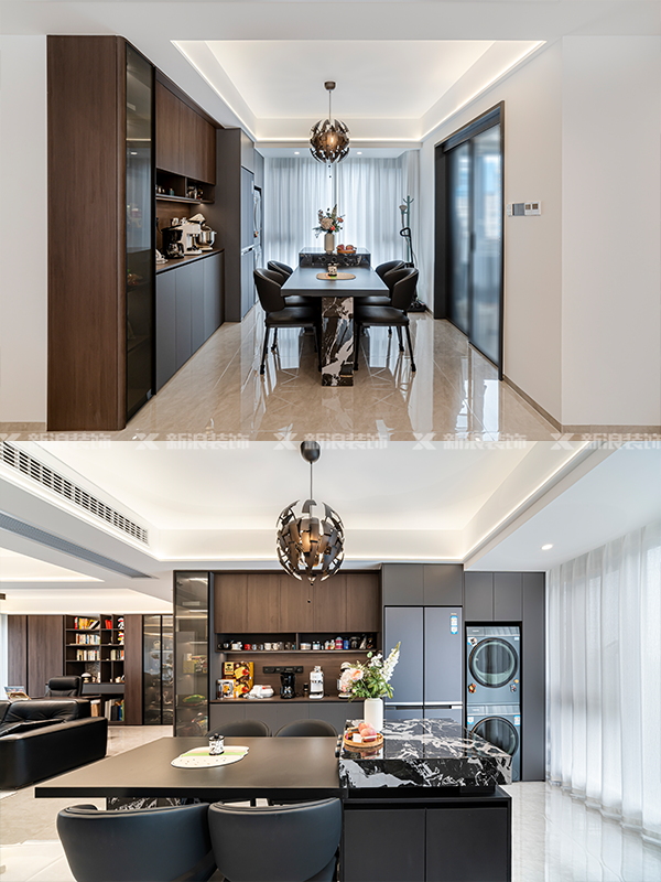 餐廳:巖板餐島臺配黑色金屬吊燈,